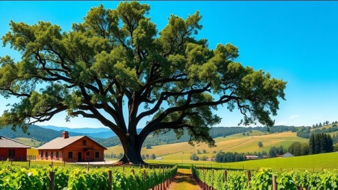 Lush vineyard with oak tree under blue sky, Experience Joullian.